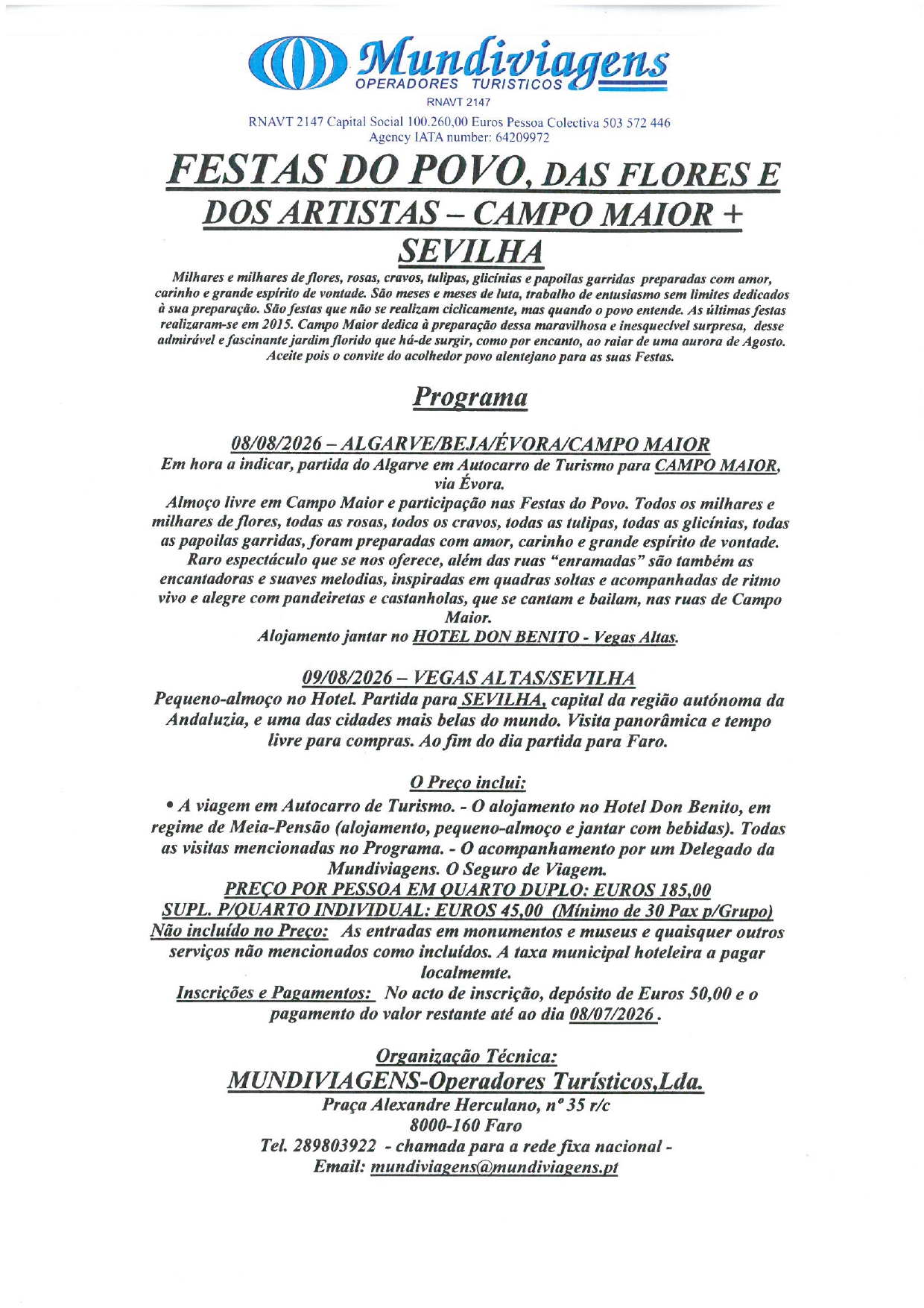 Inscrições e pagamentos: No acto de inscrição, depósito de 50€ e o pagamento do valor restante até ao dia 8 de Julho de 2026.
